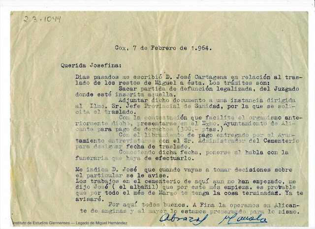 Días pasados me escribió D. José Cartagena en relación al traslado de los restos de Miguel a esta (se refiere a Cox). Los trámites son: